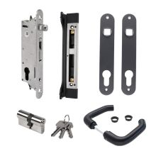 Kování na dveře a branky - venkovní hliníkové kliky povrchově upravené práškovou vypalovanou černou barvou, koule, štítky.