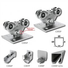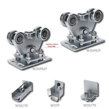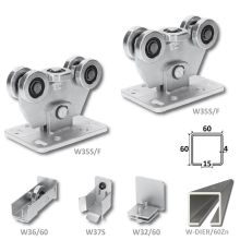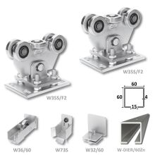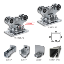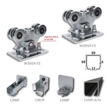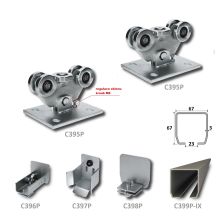 Komponenty pro výrobu nesených brany do šířky průjezdu 4,5 m a hmotnosti 400 kg - kompletní sady kování se zinkovaným nebo černým vodícím C profilem i jednotlivé komponenty. Nejprodávanější sady SA60 a SA70 s regulovatelnými vozíky stále skladem!