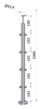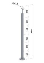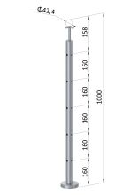 Sloupky zábradlí z nerezové broušené oceli AISI 316. Nerez AISI 316 má zvýšenou odolnost proti korozi a kyselinám, používá se hlavně v prostředí s vysokou koncentrací chloru, solí v chemických laboratořích, plaveckých bazénech apod. Průměr sloupků je 42,4 mm, síla stěny 2 mm. Jako madlo lze použít dřevěné nebo nerezové madlo s průměrem 42 mm.