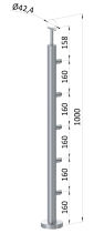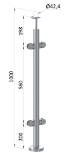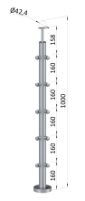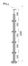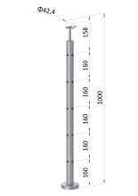Sloupky zábradlí z nerezové broušené oceli AISI 316. Nerez AISI 316 má zvýšenou odolnost proti korozi a kyselinám, používá se hlavně v prostředí s vysokou koncentrací chloru, solí v chemických laboratořích, plaveckých bazénech apod. Průměr sloupků je 42,4 mm, síla stěny 2 mm. Jako madlo lze použít dřevěné nebo nerezové madlo s průměrem 42 mm.