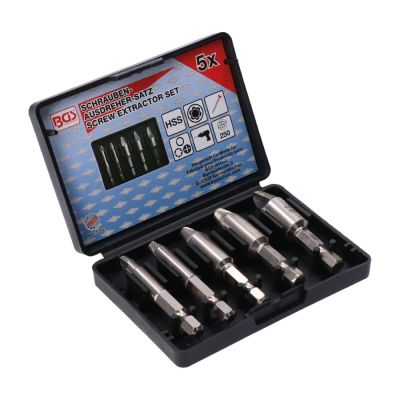 Sada bitů pro povolení poškozených šroubů, 5 dílná. Pro všechny typy šroubů s křížovou drážkou, T-profilem a vnitřním šestihranem v 5 různých velikostech. Vhodné i pro vrtačky (max. 250 ot./min). Materiál uhlíková ocel.