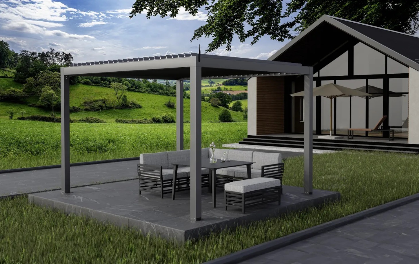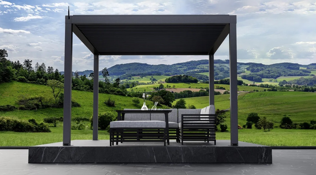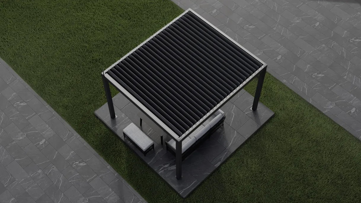 Bioklimatická volně stojící hliníková pergola, barva RAL7016 v matném provedení, pohon, dálkové ovládání.