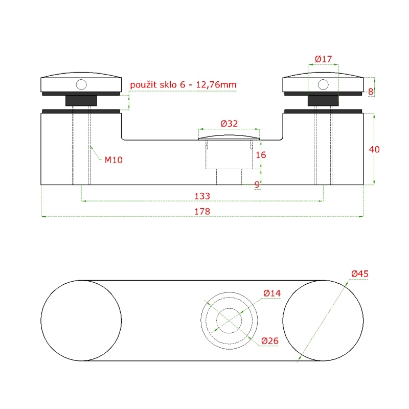 Bodové kotvení skla 6 - 12,76 mm (ploché) se dvěma bodovými svorkami skla ø 45 mm, broušená nerez K320 /AISI304. Součástí balení jsou gumičky na sklo.