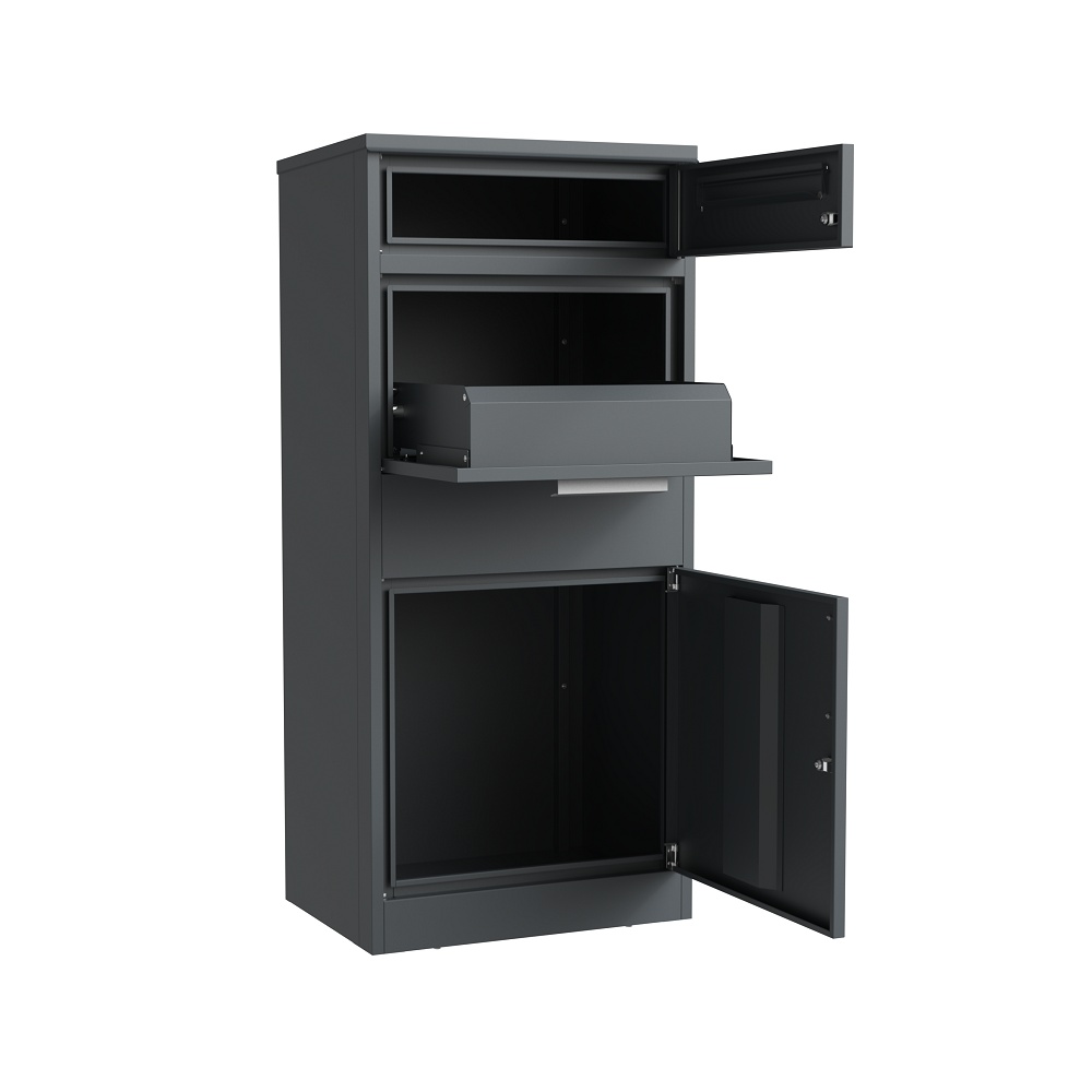 Kombinovaný box na balíky s poštovní schránkou. Barva antracit RAL7016, materiál pozinkovaný plech s práškovou barvou. Max. rozměry balíku 40 x 40 x 15 cm. Dodáváno v demontovaném stavu.