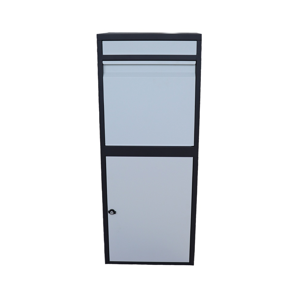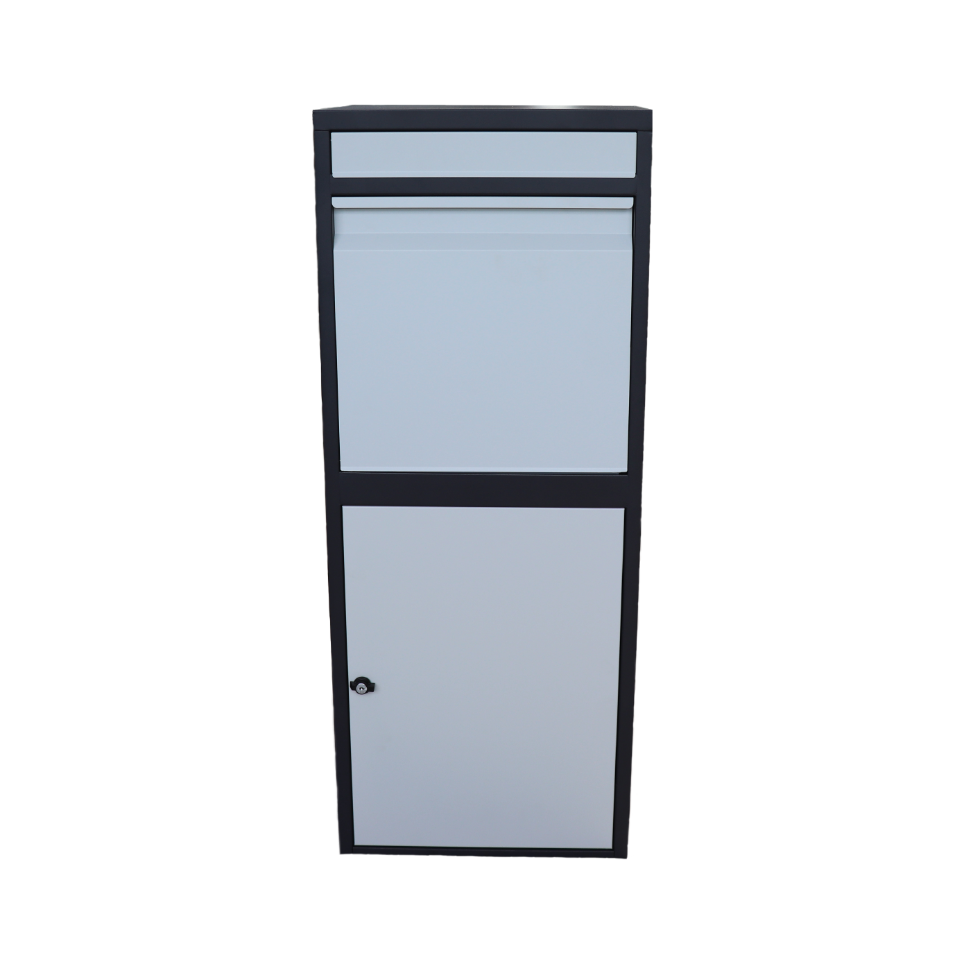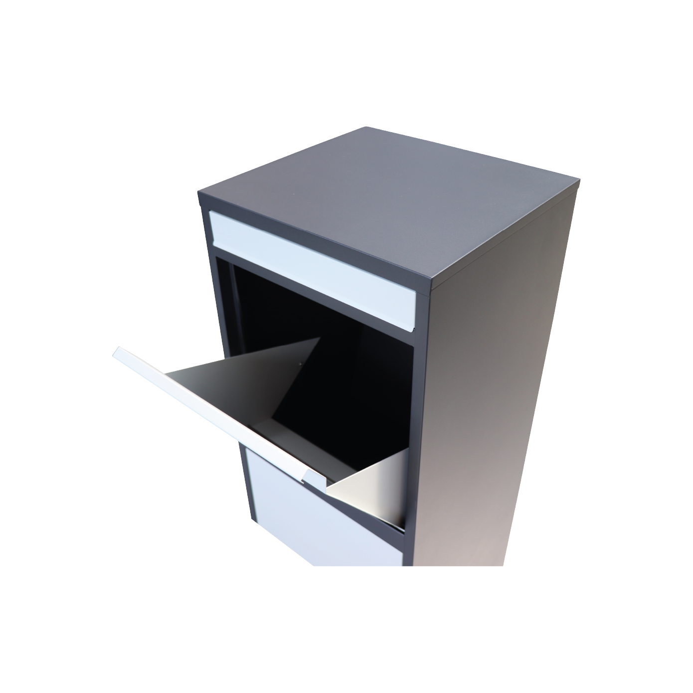 Privátní "parcel box" - schránka na balíky s přepadovou lištou na ochranu balíků, rozměr 410 x 385 x 1020 mm, tl. mat. 0,8 mm, velikost balíku až 320 x 300 x 260 mm, barva - černé tělo + bílý vhod.