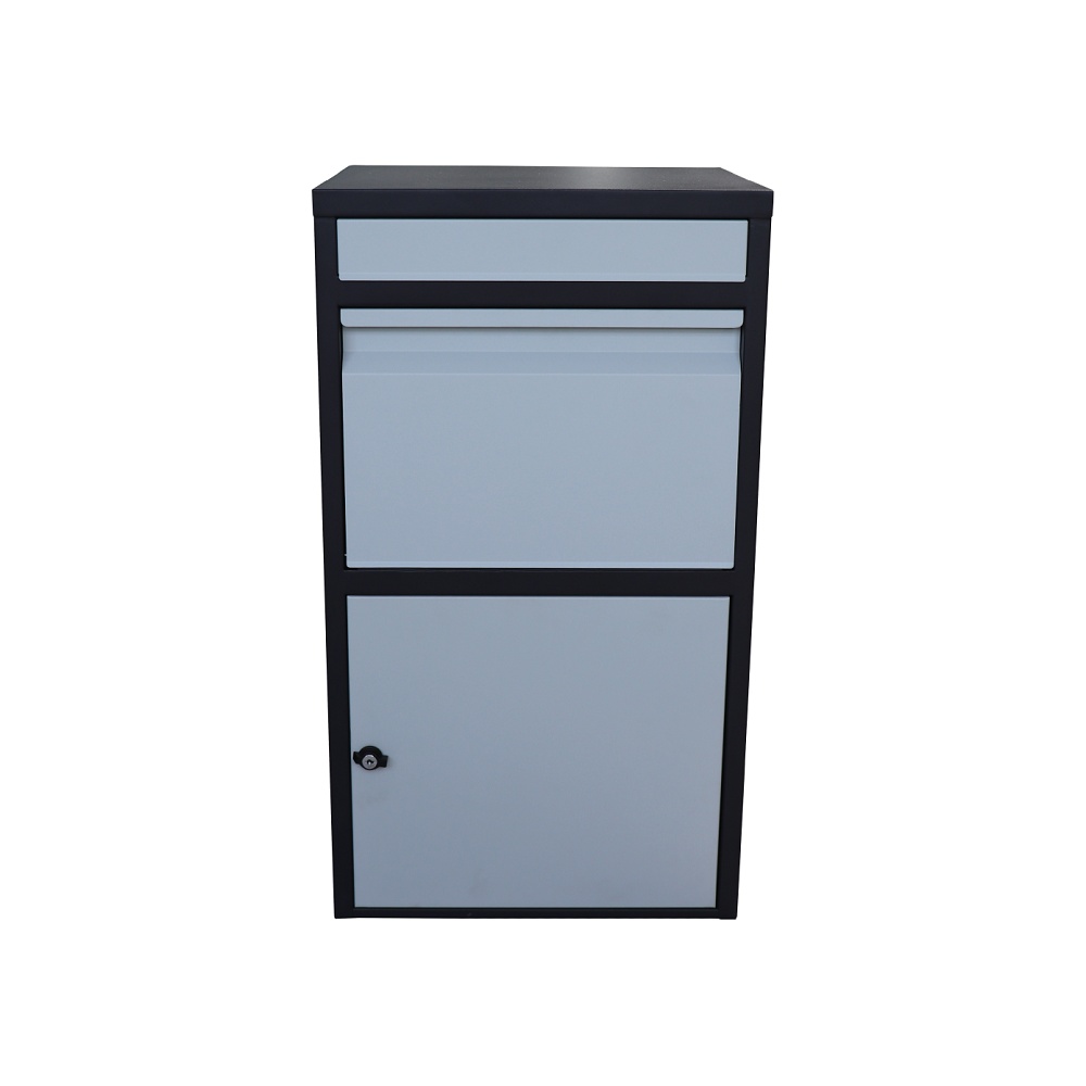Privátní "parcel box" - schránka na balíky s přepadovou lištou na ochranu balíků, rozměr 410 x 385 x 720 mm, tl. mat. 0,8 mm, velikost balíku až 320 x 300 x 180 mm, barva - černé tělo + bílý vhod.