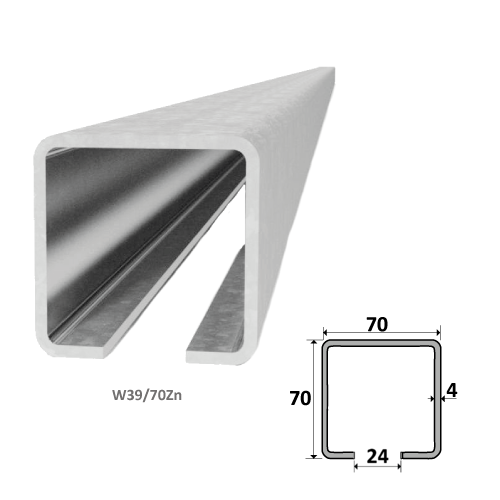 W39/70Zn - vodící nosný ocelový C profil na posuvnou samonosnou bránu, rozměr 70 x 70 x 4 mm galvanicky zinkovaný.