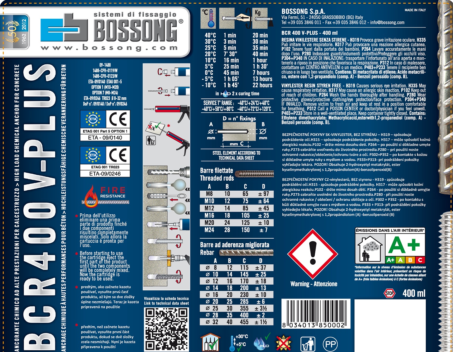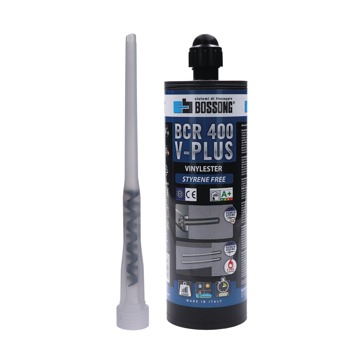 Bossong BCR 400V-PLUS - profesionální dvousložková vinylesterová, bez obsahu styrenu, 400 ml. Vhodná pro instalace v interiéru a exteriéru, v suchém a mokrém betonu a rovněž v zatopeném otvoru (instalace v zatopeném otvoru pouze pro závitové tyče). Vytvrzovací reakce probíhá i za přítomnosti vody. Nerozevírá se, čímž umožňuje kotvení blízko okraje.
