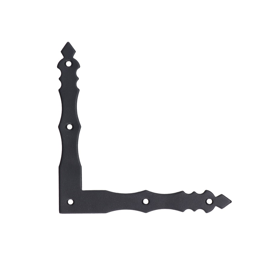 Dekorativní ozdobný rohovník, povrchová úprava černá prášková barva. Rohovníky - ploché lišty se používají při montáži rámů oken, okenic, dveří, zárubní apod.. Tvar a povrchová úprava jsou zvolené tak, aby splňovaly i funkci ozdobného prvku.