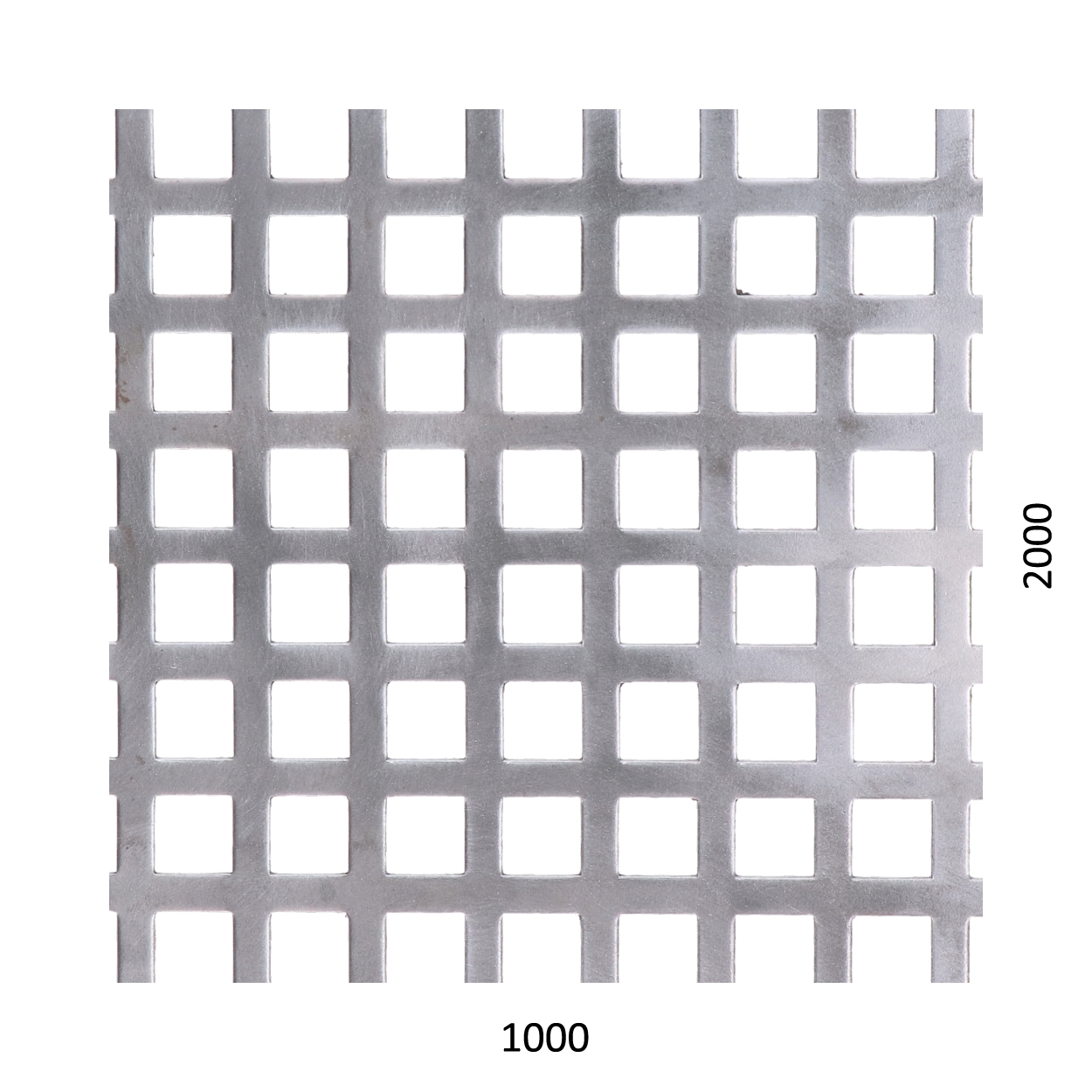 Děrovaný ocelový plech, čtvercové řadové děrování, otvor 10 x 10 mm, rozteč 14 mm, rozměr plechu 2000 x 1000 x 1,0 mm. Povrchová úprava pozink.