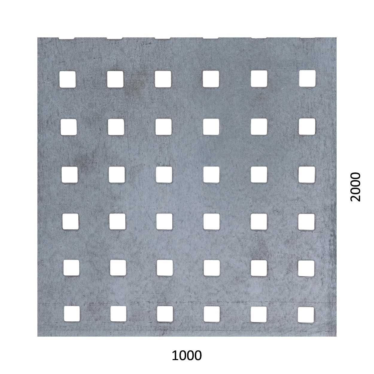 Děrovaný ocelový plech, čtvercové řadové děrování, otvor 10 x 10 mm, rozteč 30 mm, rozměr plechu 2000 x 1000 x 1,5 mm. Povrchová úprava pozink.