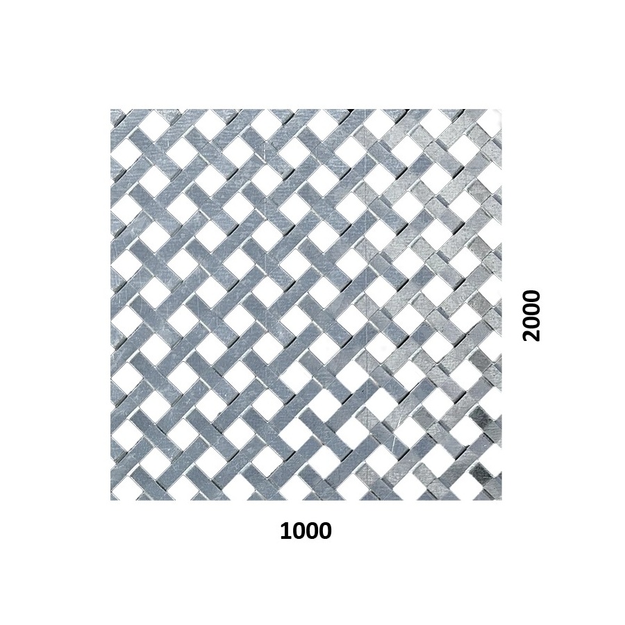 Děrovaný ocelový plech - tkanina, otvor 10 x 10 mm, rozteč 17 mm, rozměr plechu 2000 x 1000 x 1,0 mm. Bez povrchové úpravy. Aby došlo k zachování vzhledu, doporučujeme maximálně galvanické zinkování (ne žárové), barvu a patinu.