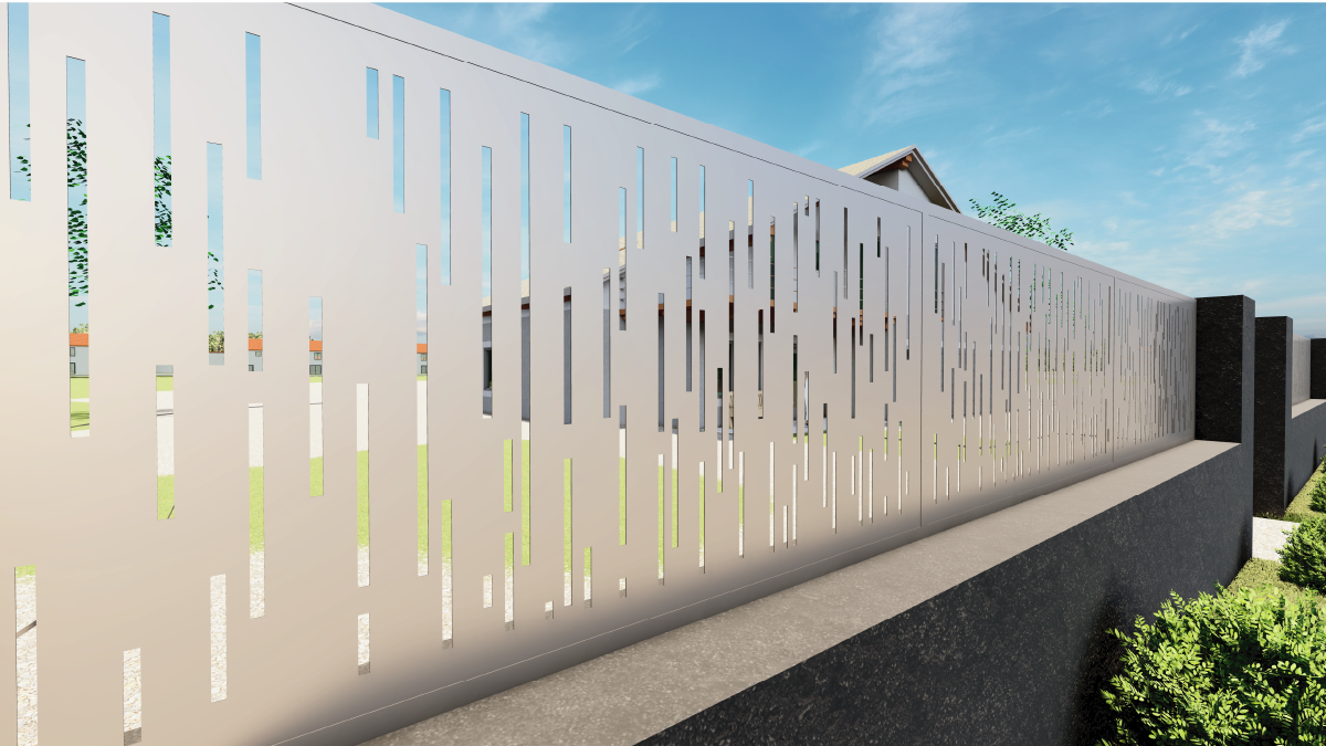 Hliníkový designový plech, laserem vypálený vzor, rozměr plechu 1000 x 2000 x 3 mm (š. x v. x tl.), výška výpalku 15,5 mm, bez povrchové úpravy. Perforace 15%. Použití - plotová výplň, pergola, zábradlí apod.