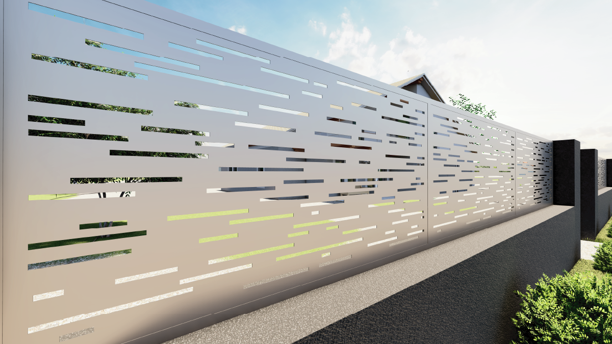 Hliníkový designový plech, laserem vypálený vzor, rozměr plechu 1000 x 2000 x 3 mm (š. x v. x tl.), výška výpalku 15,5 mm, bez povrchové úpravy. Perforace 16%. Použití - plotová výplň, pergola, zábradlí apod.