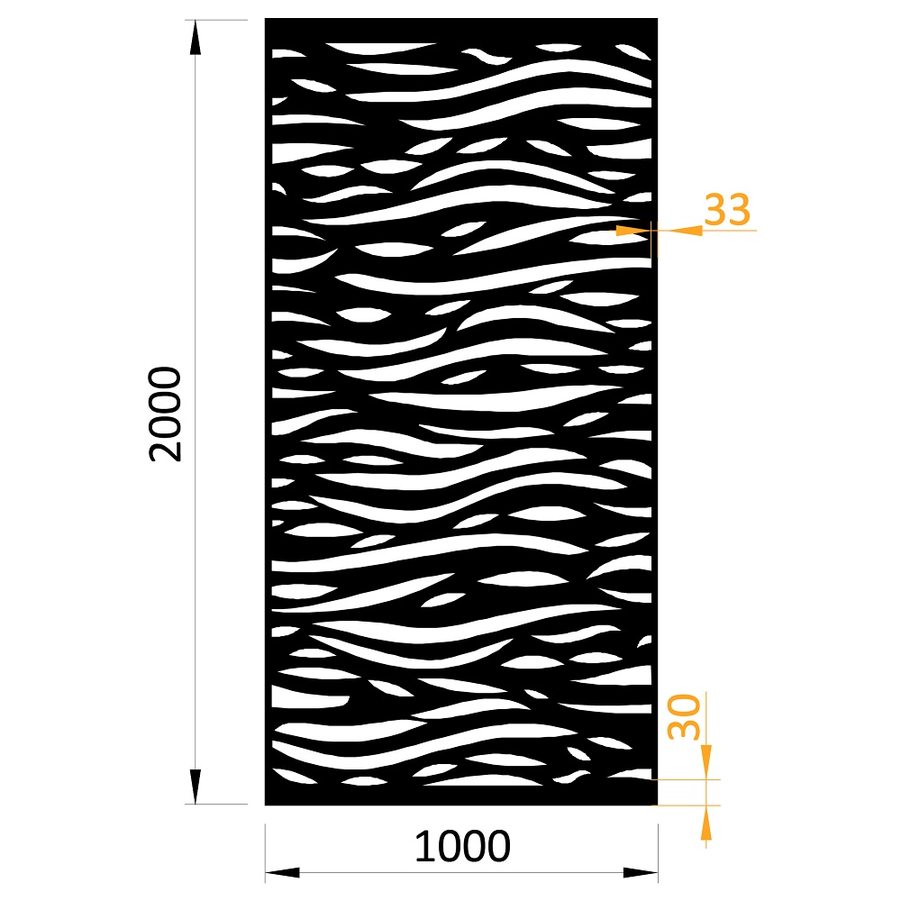 Ocelový designový plech, laserem vypálený vzor, rozměr plechu 1000 x 2000 x 2,5 mm (š. x v. x tl.). Bez povrchové úpravy. Perforace 33%. Šířka rámování (okrajů bez výpalu) je 35 mm. Použití - plotová výplň, pergola, opora pro popínavé rostliny, zábradlí, oddělovací stěna v interiéru apod.