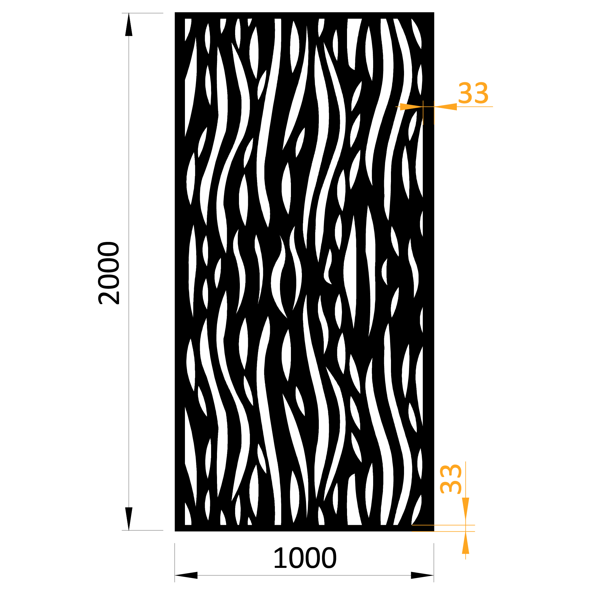 Ocelový designový plech, laserem vypálený vzor, rozměr plechu 1000 x 2000 x 2,5 mm (š. x v. x tl.). Bez povrchové úpravy. Perforace 33%. Šířka rámování (okrajů bez výpalu) je 35 mm. Použití - plotová výplň, pergola, opora pro popínavé rostliny, zábradlí, oddělovací stěna v interiéru apod.