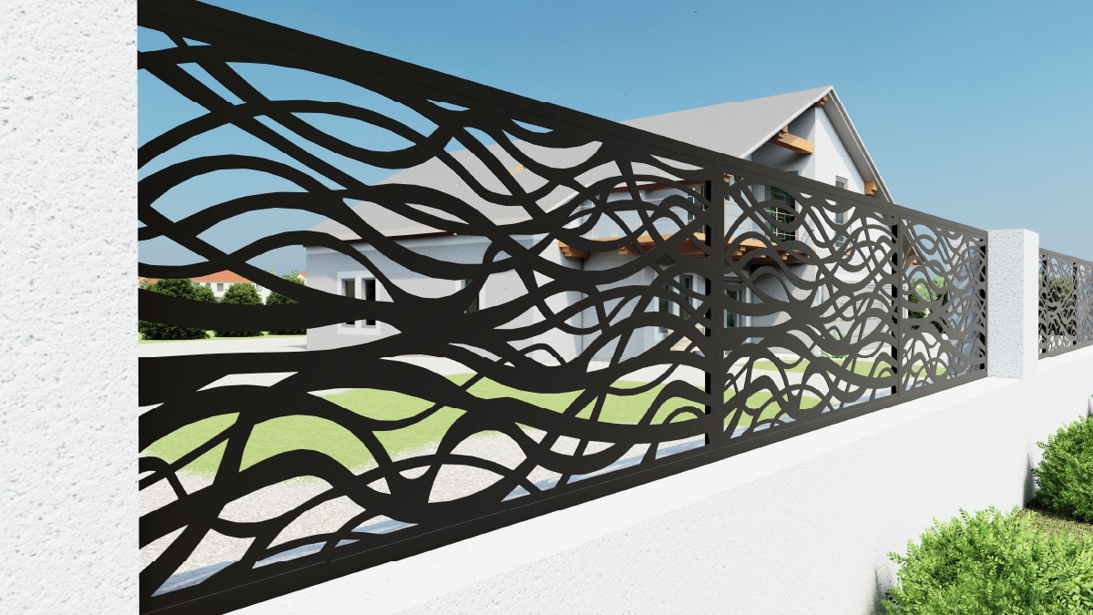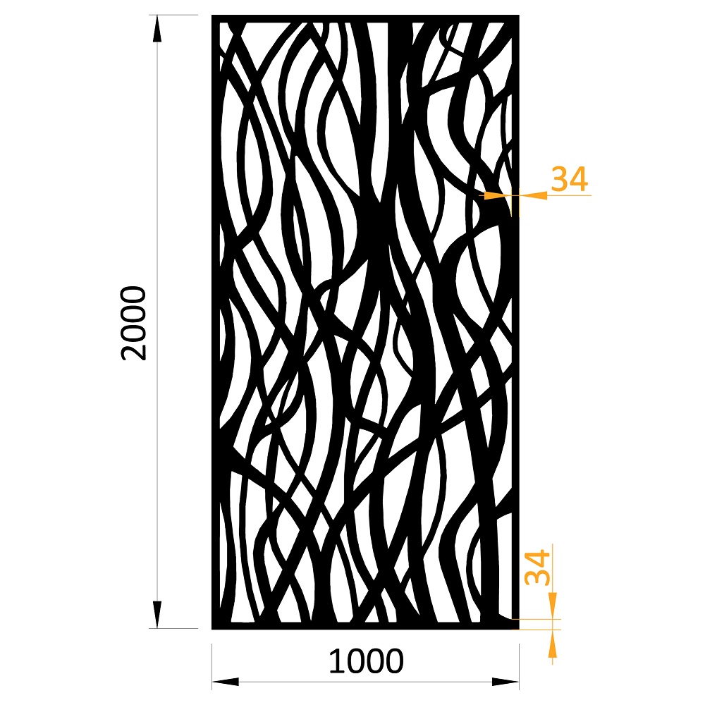Ocelový designový plech, laserem vypálený vzor, rozměr plechu 1000 x 2000 x 2,5 mm (š. x v. x tl.). Bez povrchové úpravy. Perforace 44%. Šířka rámování (okrajů bez výpalu) je 35 mm. Použití - plotová výplň, pergola, opora pro popínavé rostliny, zábradlí, oddělovací stěna v interiéru apod.
