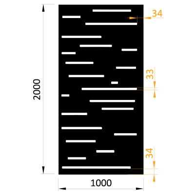 Ocelový designový plech, laserem vypálený vzor, rozměr plechu 1000 x 2000 x 2 mm (š. x v. x tl.), výška výpalku 30,1 mm. Bez povrchové úpravy. Šířka rámování (okrajů bez výpalu) je 35 mm. Perforace 14%. Použití - plotová výplň, pergola, opora pro popínavé rostliny, zábradlí, oddělovací stěna v interiéru apod.