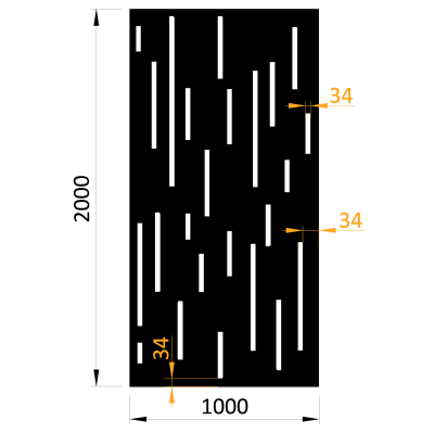 Ocelový designový plech, laserem vypálený vzor, rozměr plechu 1000 x 2000 x 2 mm, výška výpalku 34 mm. Bez povrchové úpravy. Šířka rámování (okrajů bez výpalu) je 35 mm. Perforace 14%. Použití - plotová výplň, pergola, opora pro popínavé rostliny, zábradlí, oddělovací stěna v interiéru apod.