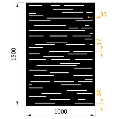 Ocelový designový plech bez povrchové úpravy, laserem vypálený vzor, rozměr plechu 1000 x 1500 x 2 mm (š. x v. x tl.), tolerance +/- 5%. Výška výpalku 15,5 mm. Šířka okrajů bez výpalu je 35 mm. Perforace 15%. Použití - plotová výplň, pergola, opora pro popínavé rostliny, zábradlí, oddělovací stěna v interiéru apod.