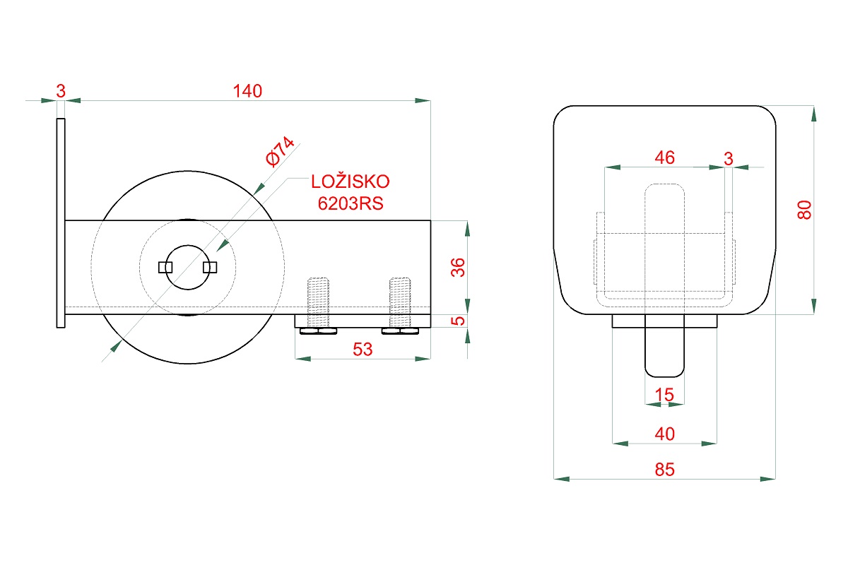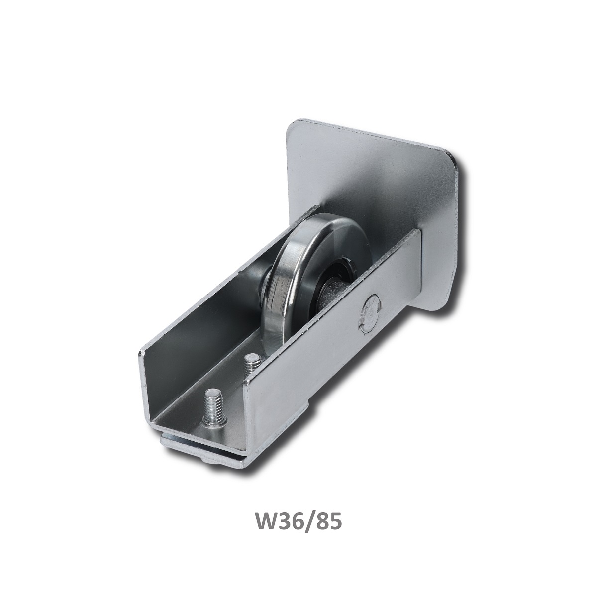 W36/85 - pozinkované dojezdové kolečko, použití pro C profil nesené brány 80 x 85 x 5 mm.