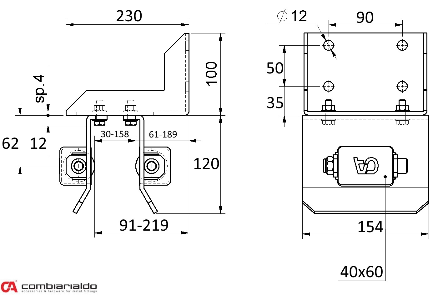 C467G - horní doraz (kapsa) kapsa pro posuvnou bránu s nylonovými kladkami 40 x 60 mm od předního italského výrobce Combi Arialdo. Hmotnost 1,7 kg.
