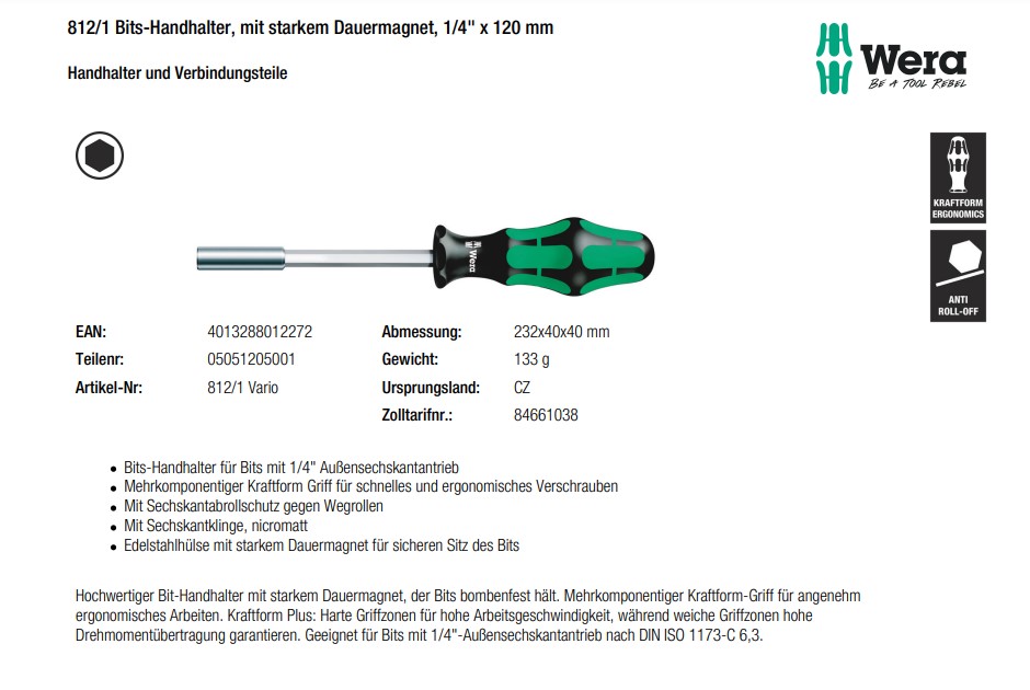 Vysoce kvalitní ruční držák bitů. Rukojeť Kraftform Plus pro pohodlnou, ergonomickou práci, která zabraňuje vzniku puchýřů a mozolů. Tvrdé úchopové zóny pro vysokou pracovní rychlost, zatímco měkké úchopové zóny zaručují přenos vysokého točivého momentu. Vhodné pro bity s 1/4″ externím šestihranným pohonem.