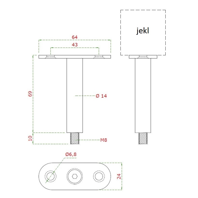 EB1-0400-S - držák madla s rovnou deskou (pro hranaté madlo), šířka 64 mm, výška 69 mm, bez nastavení sklonu, závit M8, materiál broušená nerez K320/AISI304.