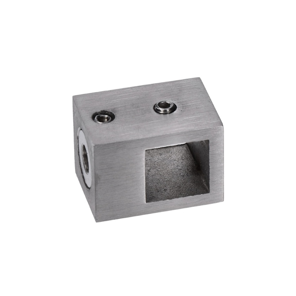 EB1-SJ15 - nerezový úchyt - přechodový držák výplně - tyče 15 x 15 mm, rozměr 30 x 22 x 22 mm, plochý (na čtyřhranný sloupek), broušená nerez K320/AISI304.
