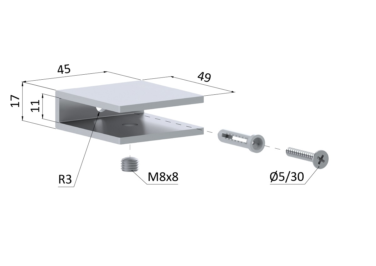 Držák skleněné police pro sklo 8 - 10 mm, materiál broušená nerez K320 / AISI304. ...Ukaž celý popis >