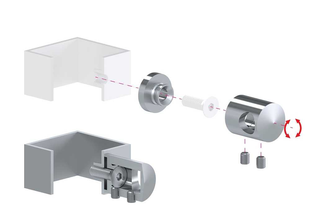 EL1-0214 - nerezový úchyt - držák výplně ø 14 mm s uchycením na rovnou plochu, délka 30 mm, ø 22 mm, leštěná nerez AISI304.