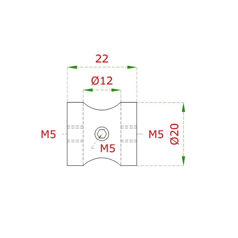 EB1-0230 - nerezový úchyt - držák výplně ø 12 mm s uchycením na rovnou plochu, délka 20 mm, ø 22 mm, oboustranný závit M5, broušená nerez K320/AISI304.