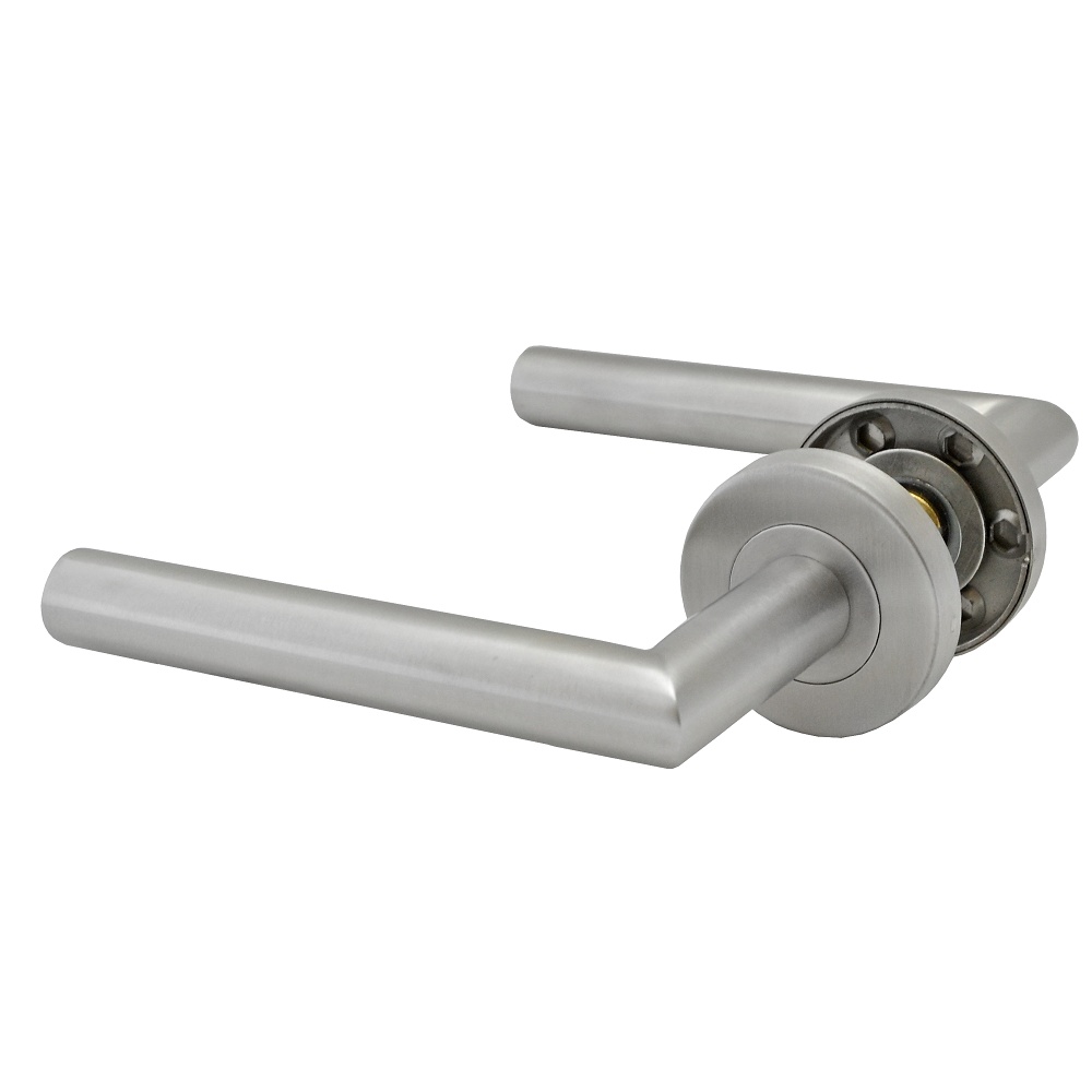 EB1-KLD04N - nerezová dveřní klika, 1 pár, broušená nerez K320/AISI304. Spodní část rozety nerezová. Vhodné i do venkovního prostředí.