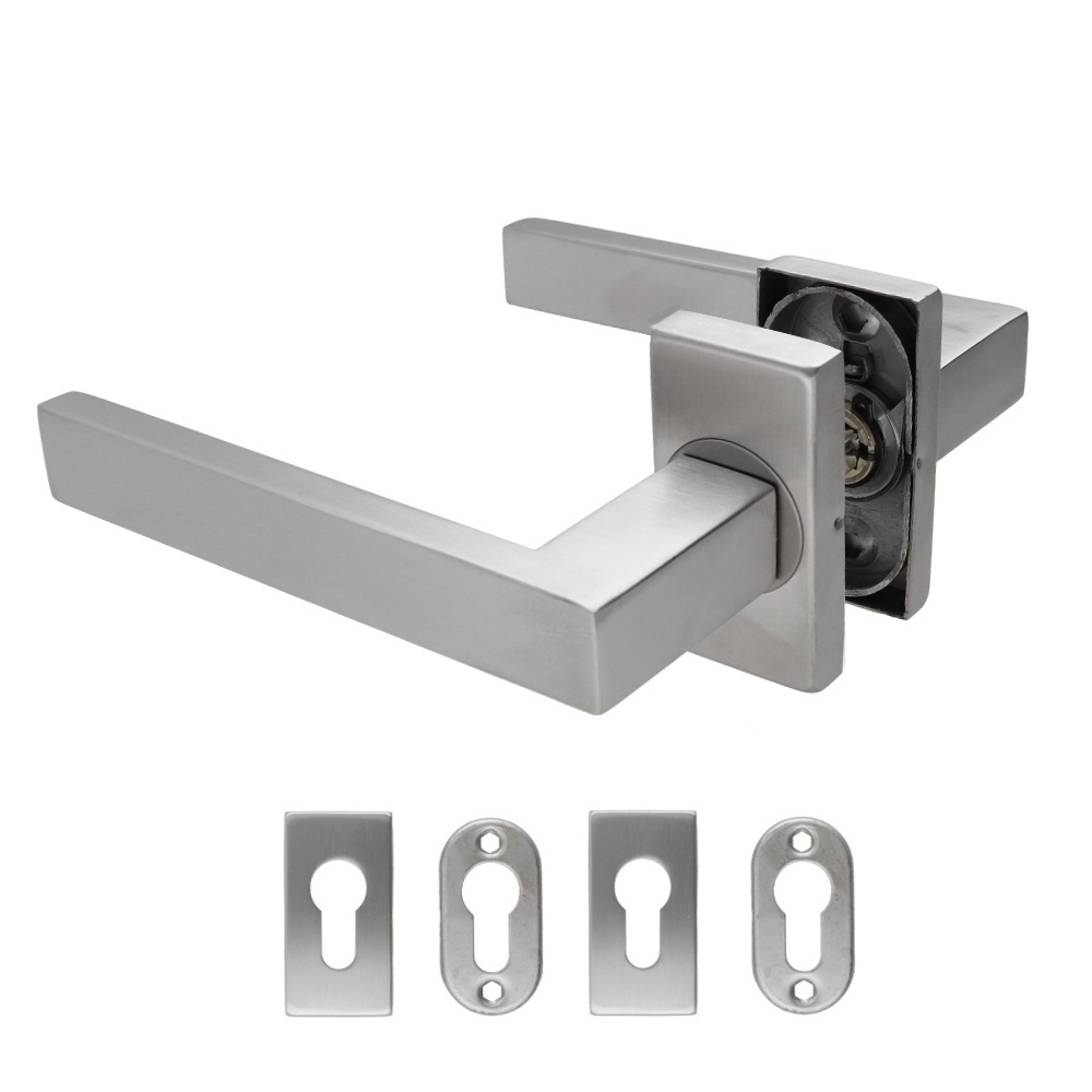 EB1-JKOR02 - nerezová dveřní klika včetně dolní obdélníkové rozety, 1 pár, broušená nerez K320/AISI304. Vhodné i do venkovního prostředí.