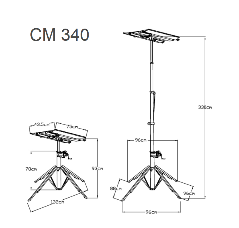 | CM 340 | 0,9 m | 3,3 m | 130 kg - 3 m, 120 kg - 3,3 m |