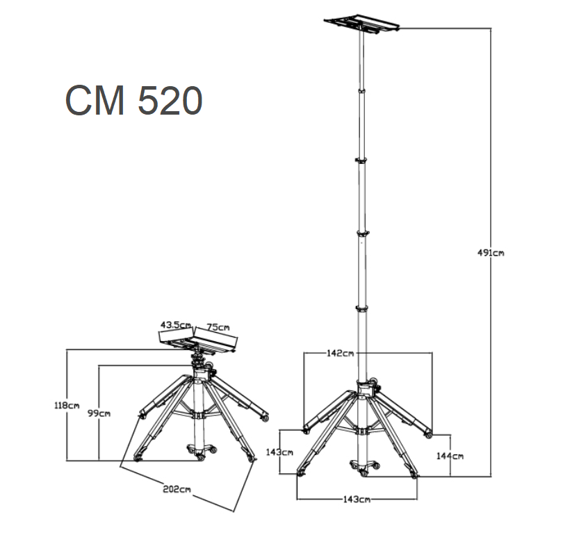 Díky čisté hmotnosti pouhých 38 kg a praktickým vnějším rozměrům se tento zvedák vejde do jakéhokoli vozidla a je rychle připravený k použití. CM 520 je vybavený brzděnými koly na patkách a středním sloupku. Volitelným doplňkem je prodloužení nosné desky a kryt motoru.