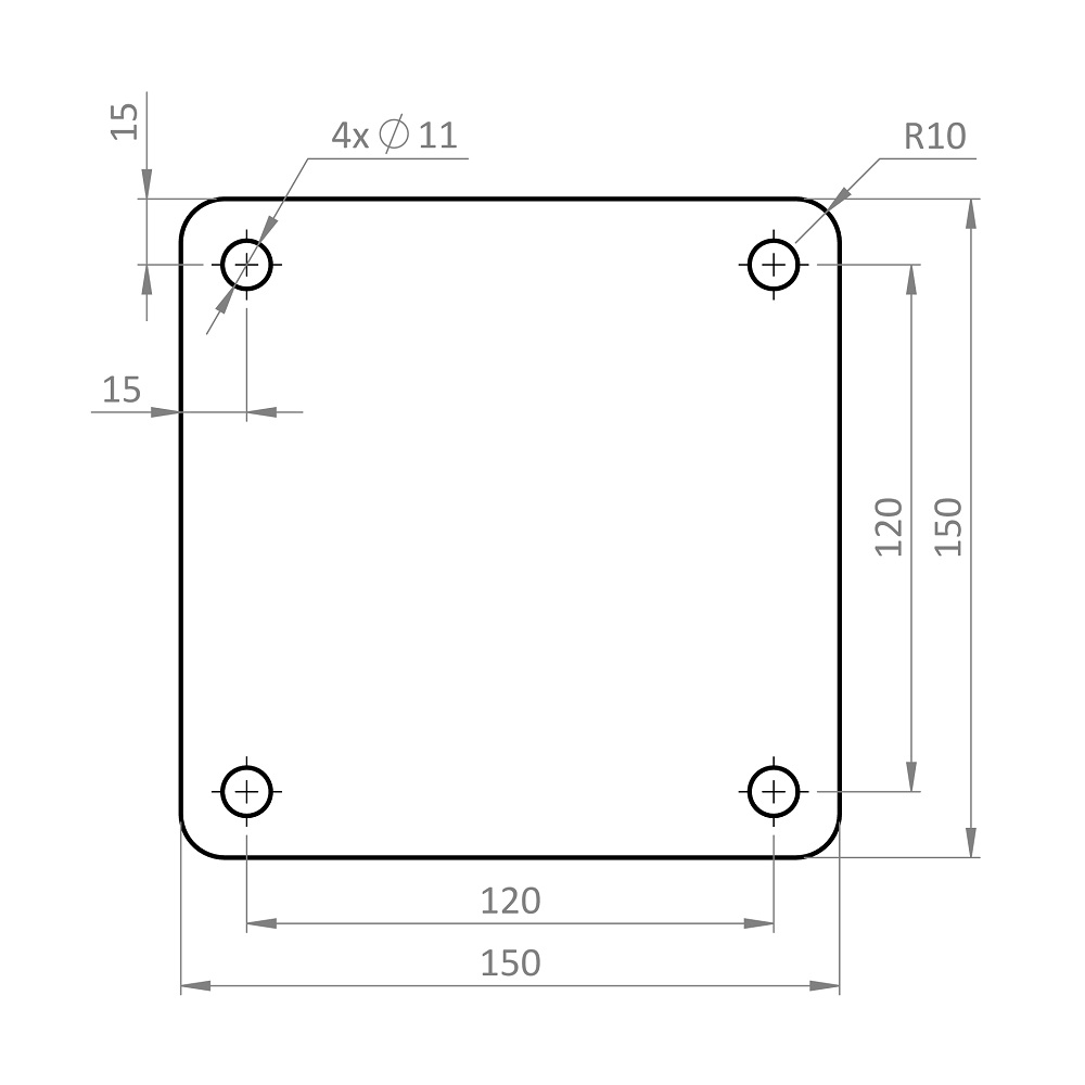 Hliníková patka 150 x 150 mm, výška 10 mm, bez povrchové úpravy.