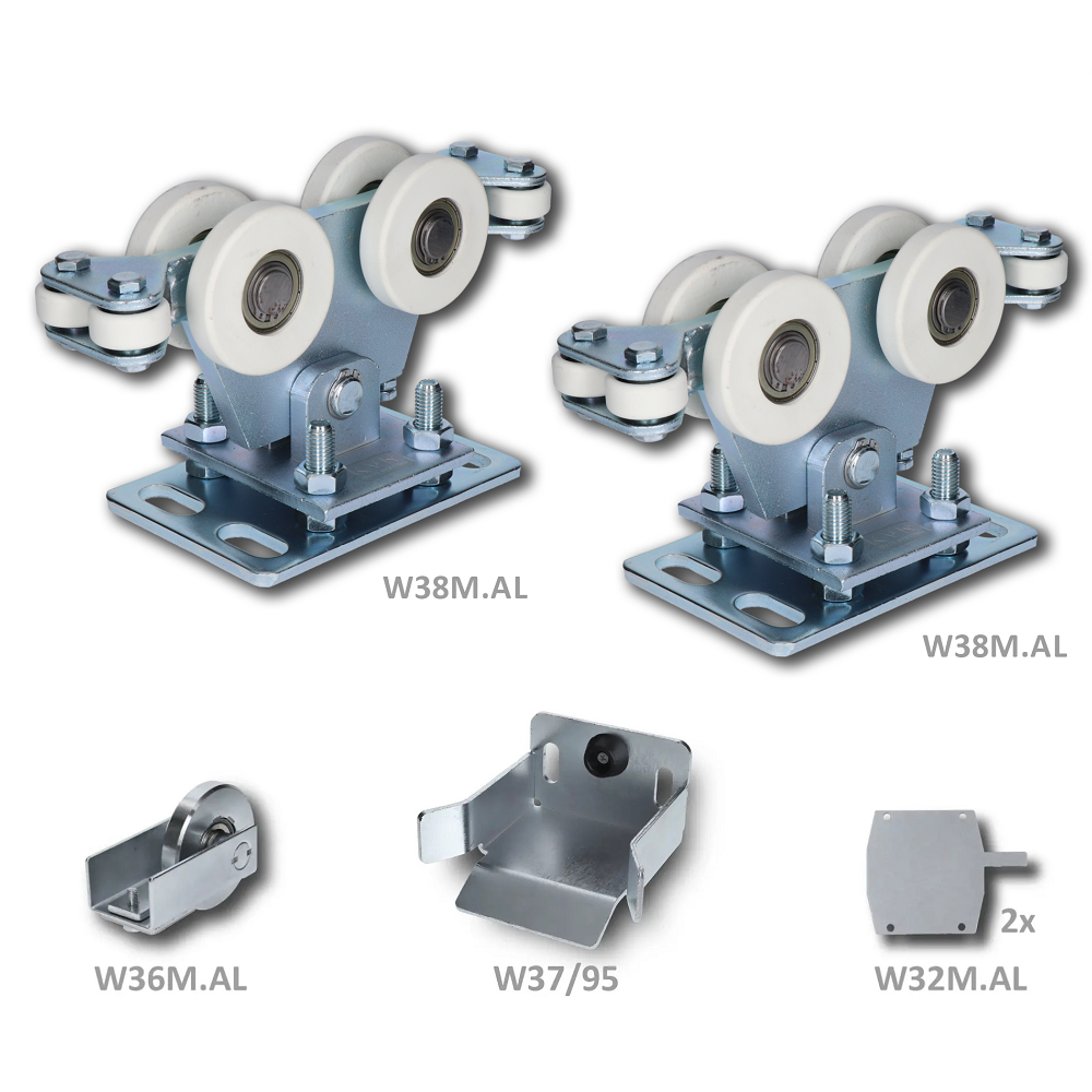 Sada hliníkového kování (bez C profilu) na posuvnou samonosnou bránu do průjezdu 6,5 m a hmotnosti do 150 kg. Set obsahuje dva unikátně navržené vozíky s 8 nylonovými kolečky, která zaručují tichý a plynulý chod brány, náběhové kolečko, 2 záslepky profilu a dojezdovou kapsu brány.