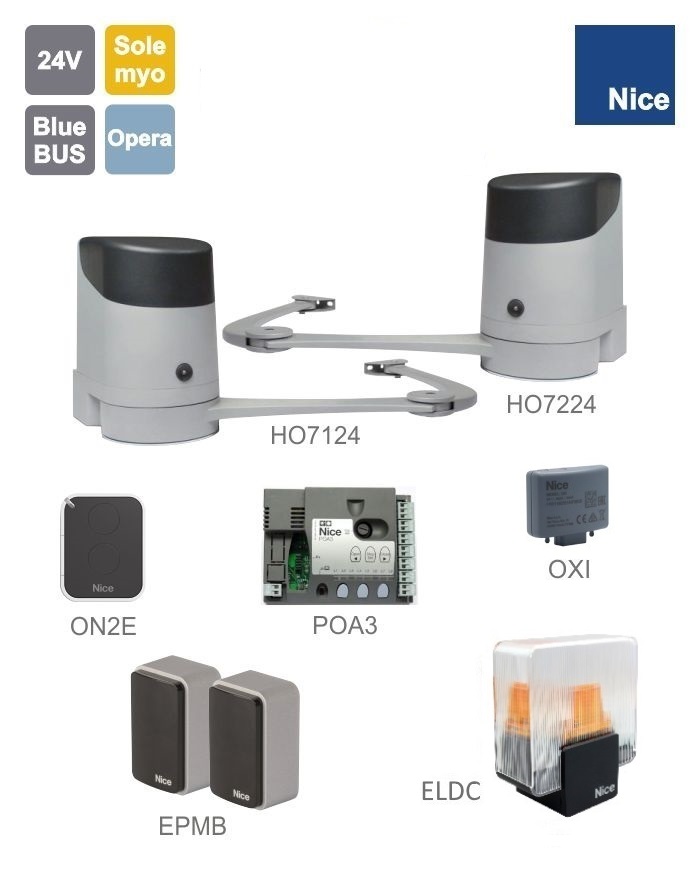 NICE HOPPKit-K - sada pákových pohonů s dálkovým ovládáním, fotobuňkami a majákem pro dvoukřídlou bránu se šířkou křídla max. 2,4 m (průjezd 4,8 m). Technologie BlueBus.