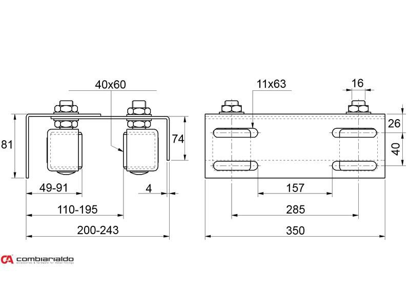 C462G - horní vedení brány Grande 350 x 92 mm se 4 vodícími kladkami 40 x 60 mm s krytem, M16 od předního italského výrobce Combi Arialdo. Povrchová úprava - pozink. Použití pro posuvné brány. Hmotnost 5,63 kg.