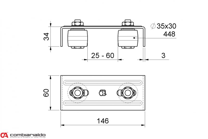 C460 - horní vedení brány 146 x 60 mm se 2 nylonovými kladkami 35 x 30 mm od předního italského výrobce Combi Arialdo. Povrchová úprava - pozink. Použití pro posuvné brány. Hmotnost 0,63 kg.