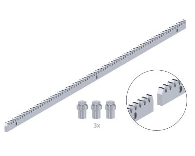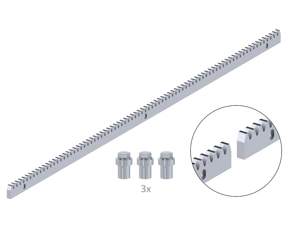 CREM-10 - hřeben pro posuvné brány ocelový pozinkovaný 30 x 10 x 1000 mm, 3 x úchyt + šrouby, povrchová úprava galvanické zinkování, maximální zatížení 1700 kg. Pro pohony s pastorkem M4.