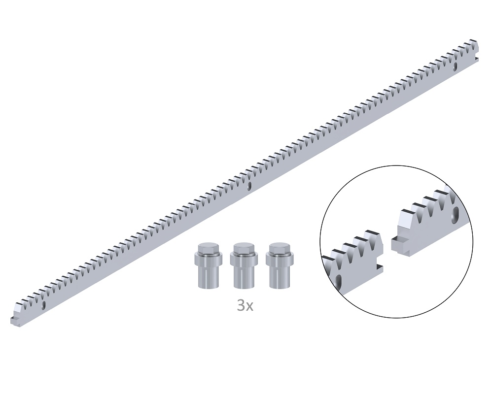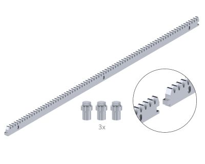 CREM-10K - hřeben pro posuvné brány ocelový 30 x 10 mm, délka 1000 mm, 3 x úchyt + šrouby, se zámkem, povrchová úprava galvanické zinkování, maximální zatížení 1700 kg. Pro pohony s pastorkem M4.