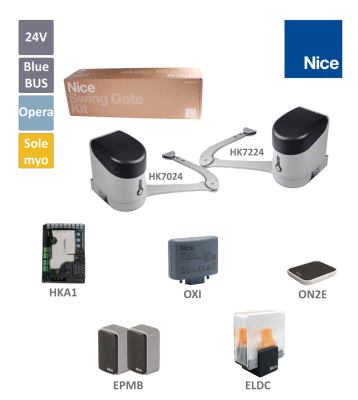 HykeKit-K - sada 24V ramenových (pákových) pohonů s dálkovým ovládáním, fotobuňkami a majákem pro křídlovou bránu se šířkou křídla max. 3,5 m (průjezd 7 m) a hmotností do 330 kg/křídlo. Hyke je pohon vhodný pro brány se širokými sloupky, zapuštění až 400 mm.