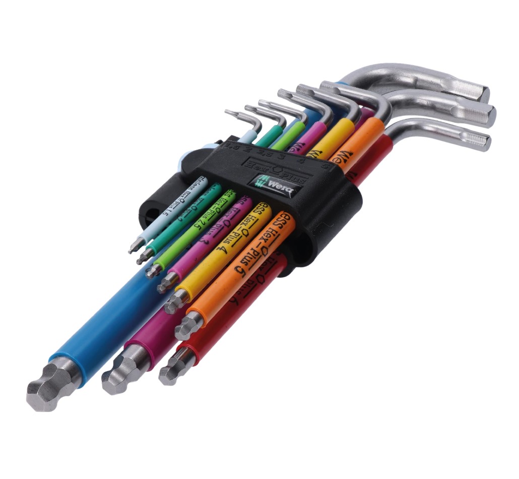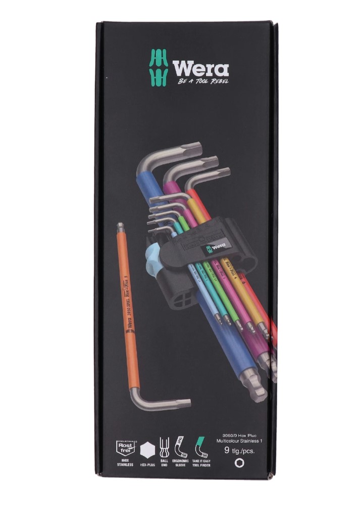 Wera sada inbusových klíčů 3950 SPKL/9 SM - 9, kusů, sada určená pro nejrůznější práce v dílně i domácnosti. Robustní ušlechtilá ocel eliminuje riziko přenesené koroze. Dlouhé rameno je opatřeno kulovou hlavicí, která umožňuje použití klíčů i na obtížně přístupných místech. Klíče s barevným pláštěm usnadňují rozpoznání velikosti. Praktický držák pro přehledné uložení klíčů.