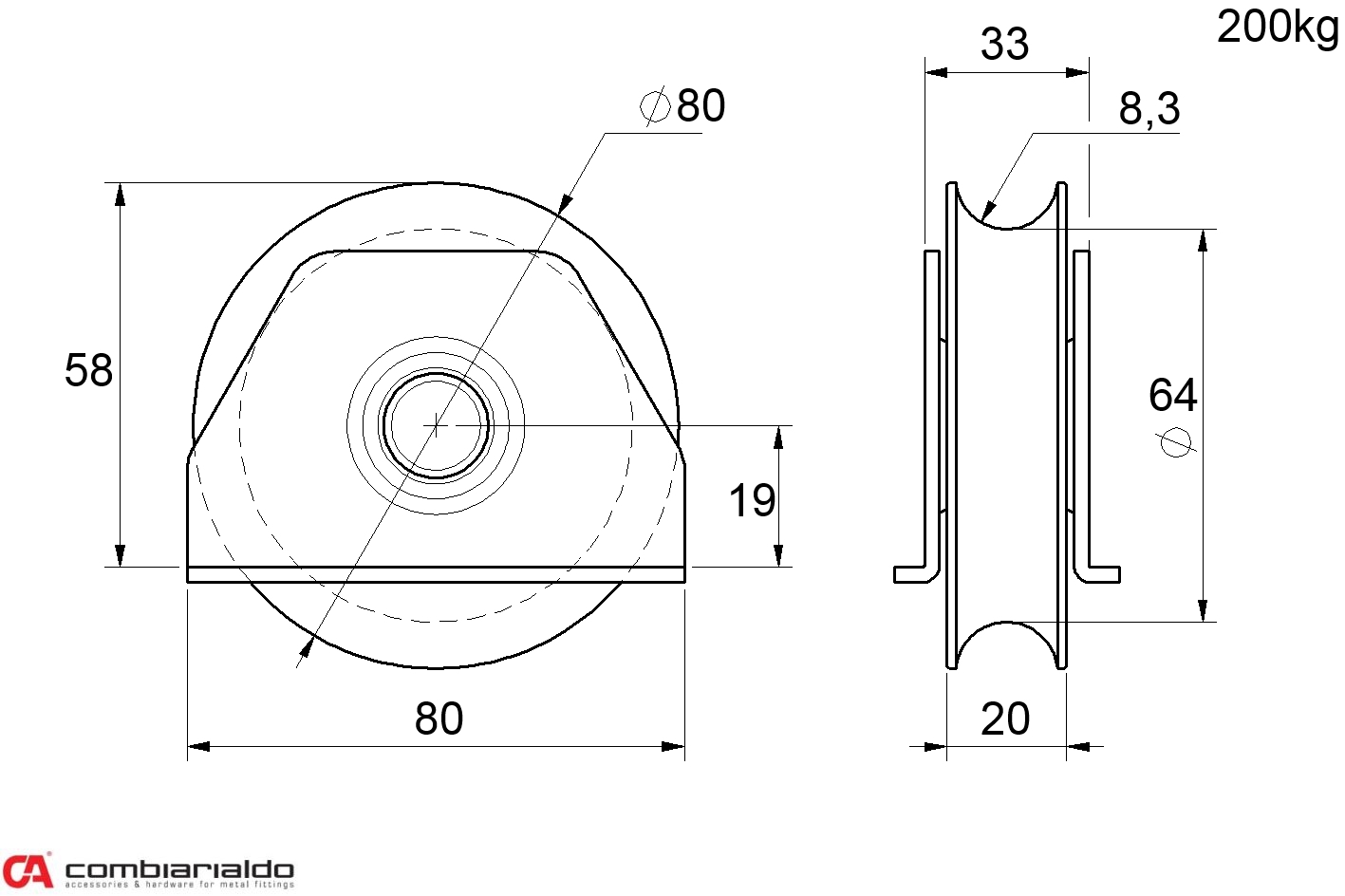 C415/80/16 - kladka ø 80 mm na přivaření jednoložisková, drážka tvaru "U", nosnost 200 kg, povrchová úprava pozink, hmotnost 0,7 kg. Použití pro posuvnou bránu. Výrobek předního italského výrobce Combi Arialdo.