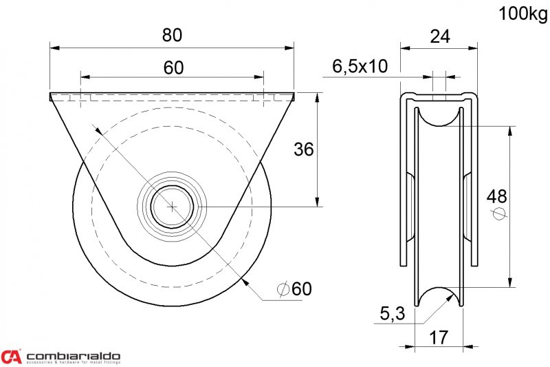 C410/60 - kladka ø 60 mm s pevnou konzolou jednoložisková, drážka tvaru "U" ø 13 mm, nosnost 100 kg, povrchová úprava pozink, hmotnost 0,37 kg. Výrobek předního italského výrobce Combi Arialdo.