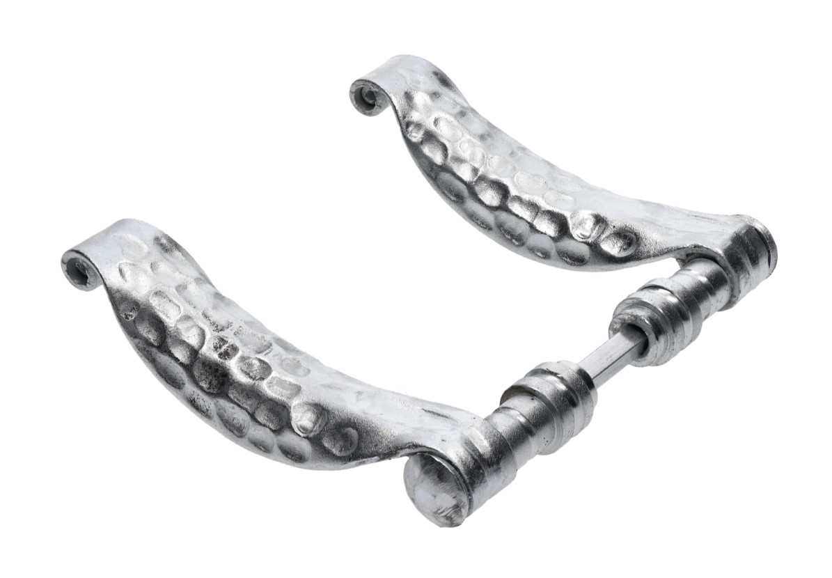KLU14 - ozdobná kovaná klika 155 x 80 mm, průměr osazení na štítek 19 mm, balení 1 pár + hřídel kliky.