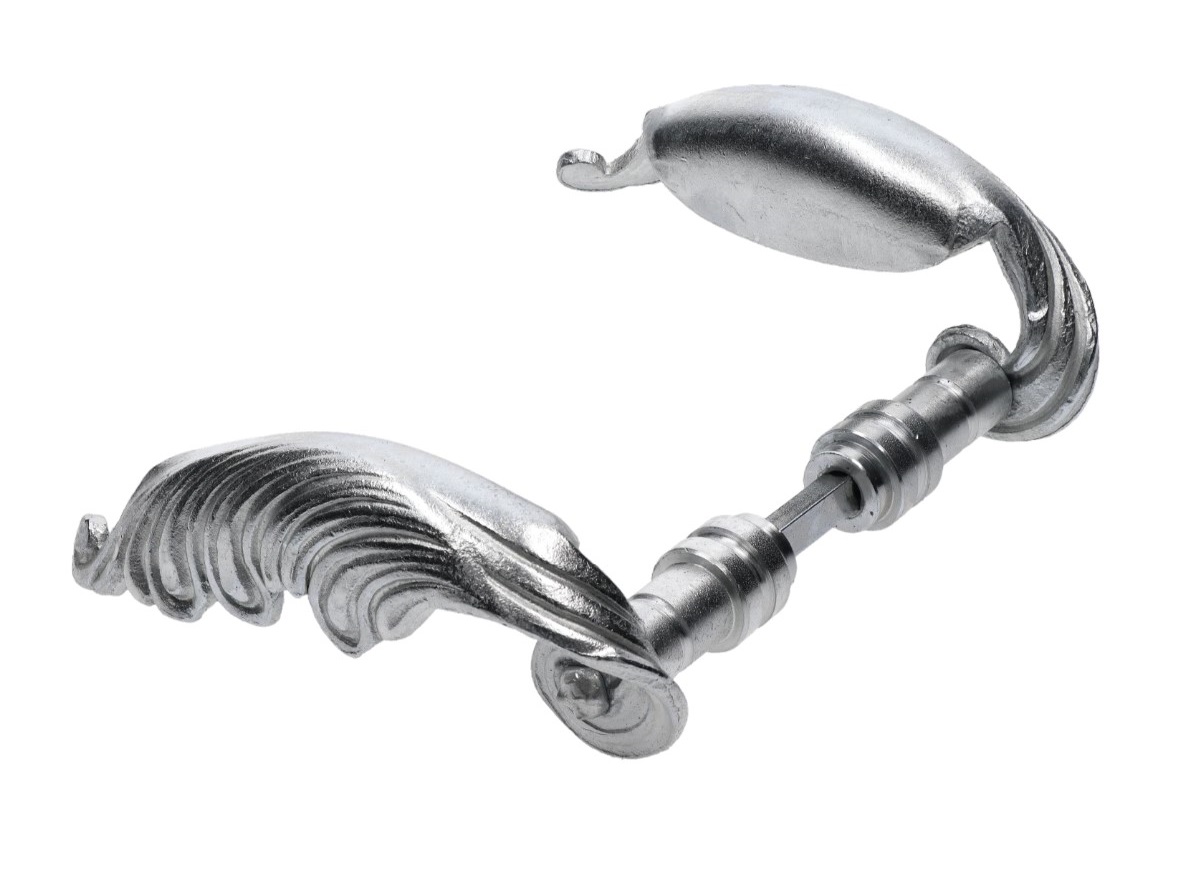 KLU15 - ozdobná kovaná klika 150 x 80 mm, průměr osazení na štítek 19 mm, balení 1 pár + hřídel kliky.