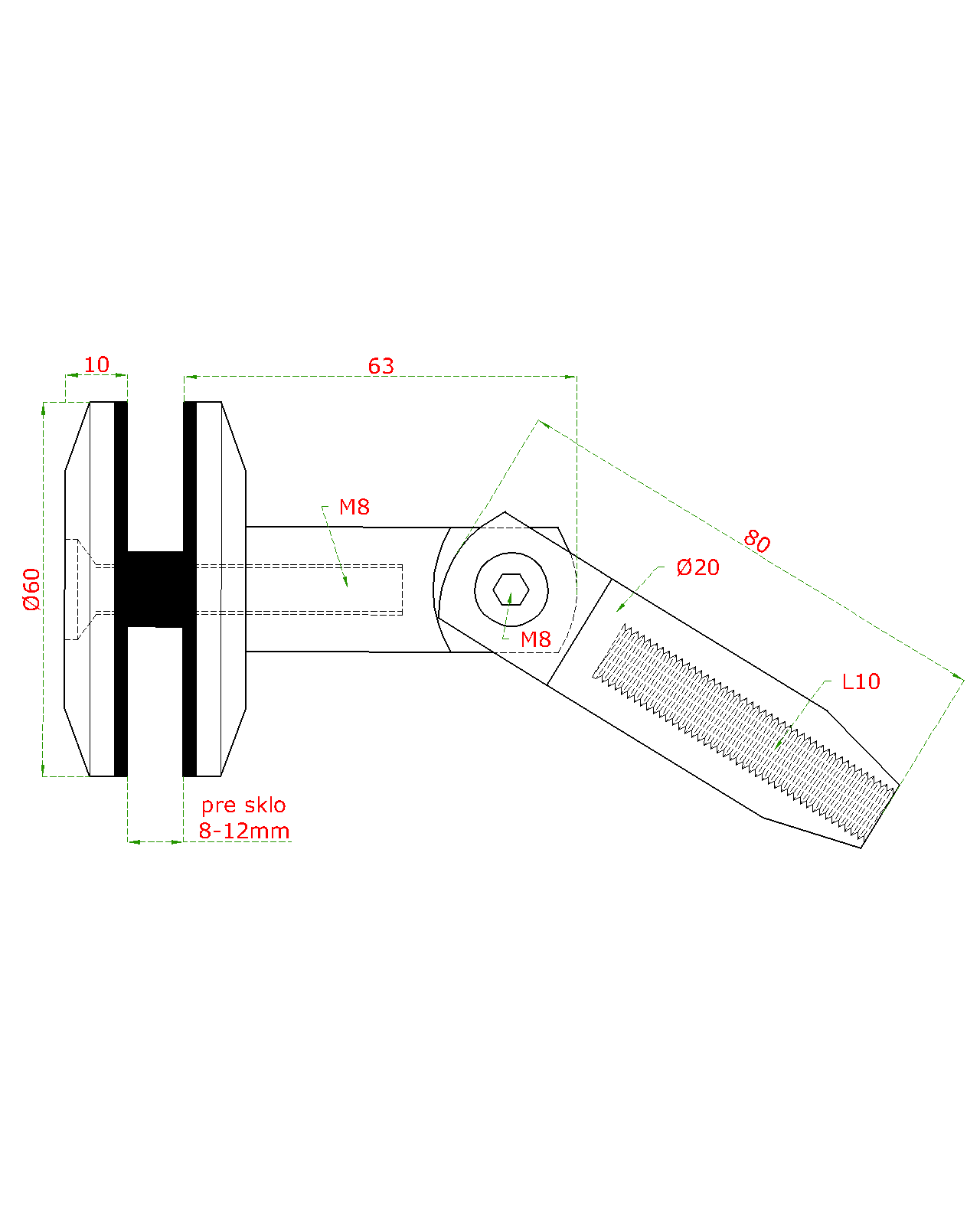 EB1-PRJ8 - kotvení sklo / táhlo na skleněný přístřešek, určené pro sklo 8,00 - 12,00 mm, závit M10, ...Ukaž celý popis >